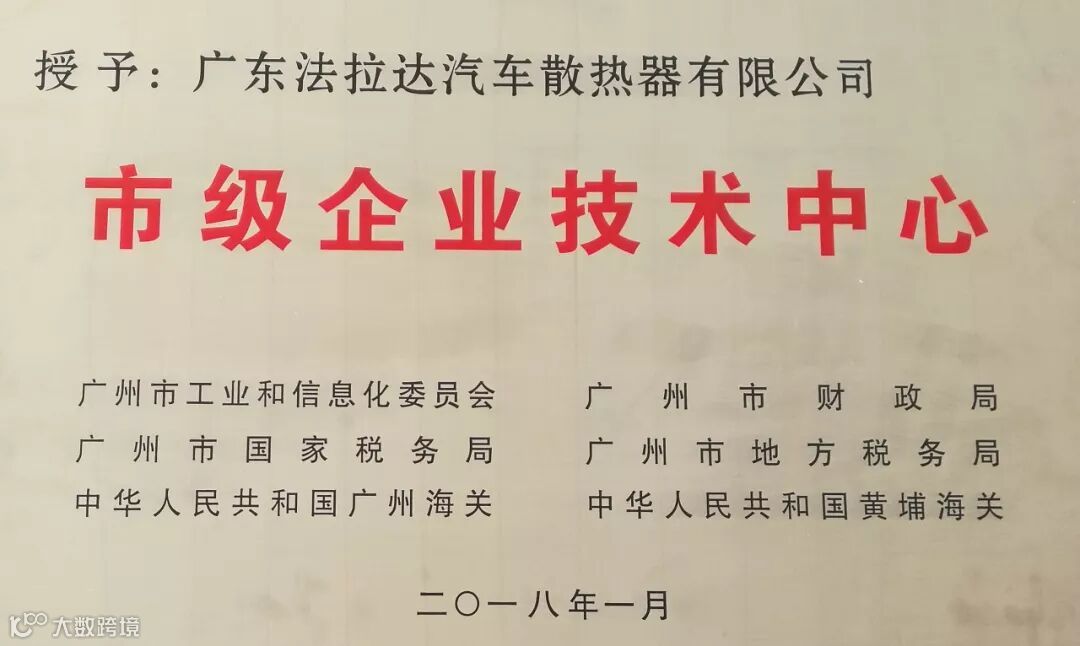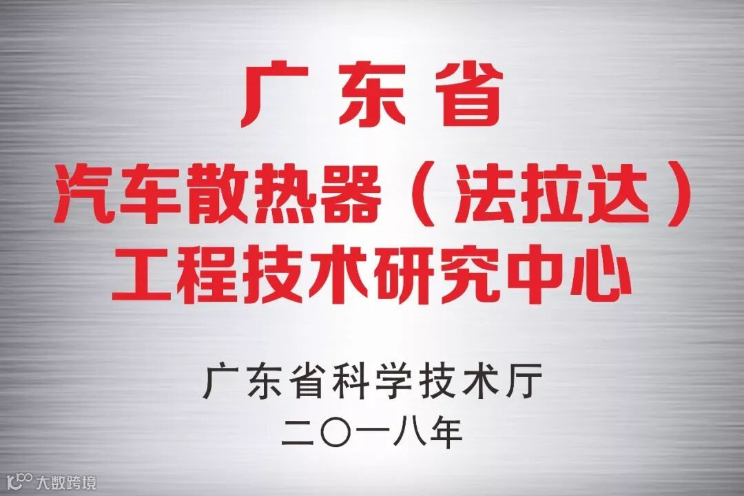 法拉达集团不仅分别荣获广州市、天津市市级企业技术中心荣誉称号,经企业申报资料初审,申报数据公示、工厂现场审查、专家综合评价等一系列流程后,荣获了广东省工程技术研究中心荣誉称号。2018年11月法拉达与天津工业大学产学研合作签约仪式在天津法拉达公司隆重举行,法拉达集团战略携手天津工业大学和汽车研究院,走产学研相结合的技术创新之路,不断为全球散热器领域贡献中国智慧和中国力量。