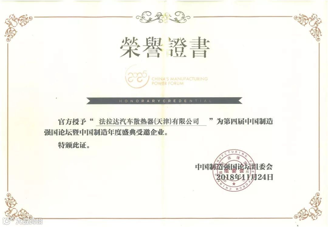 法拉达集团在2018年度受邀参加内燃机热管理技术交流大会,与行业精英分享交流了汽车热系统管理领域经验,5月受邀参加海关AEO高级认证企业座谈会,并在11月受邀参加第四届中国制造强国论坛暨中国制造年度盛典,为中国制造振兴实业贡献力量。受邀参加2018中国汽车零部件行业年会中国内燃机工业科技创新大会,参加中国创新创业大赛并获得优胜奖!受邀参加粤港澳大湾区发展论坛,共赢新时代湾区发展未来!