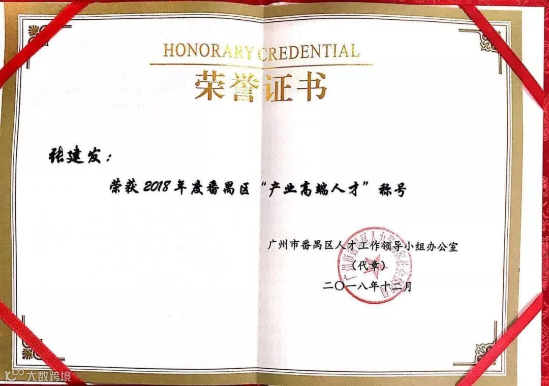 张建发董事长荣获改革开放四十年番禺优秀企业家荣誉称号