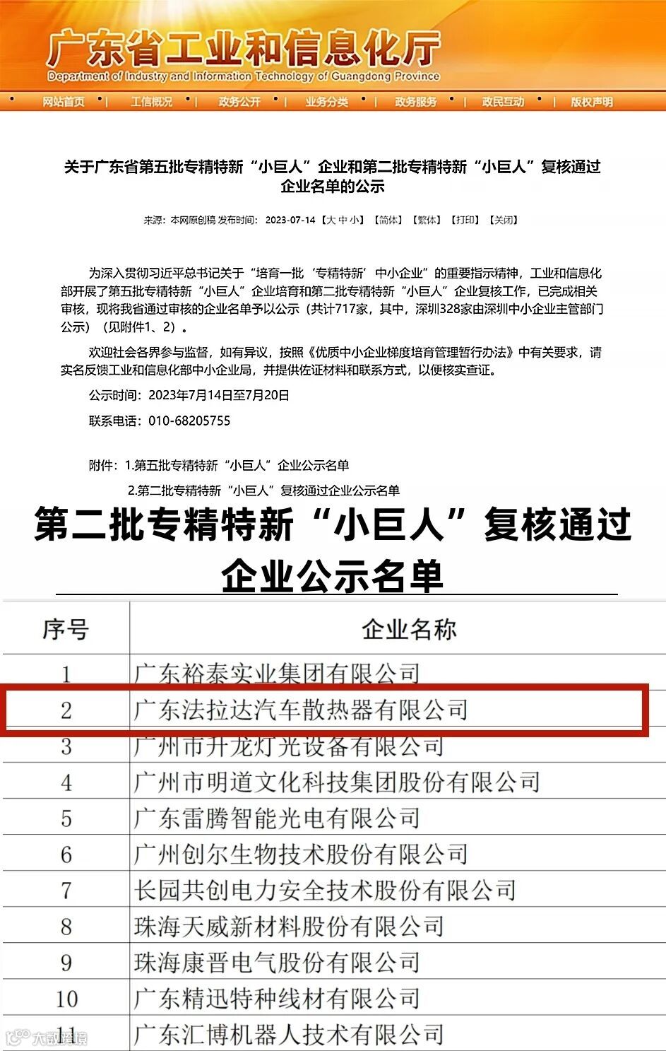近日,根据广东省工业和信息化厅发布的《关于广东省第五批专精特新“小巨人”企业和第二批专精特新“小巨人”复核通过企业名单的公示》。法拉达通过国家工信部第二批专精特新“小巨人”企业复审。据悉:第二批专精特新“小巨人”复核通过仅41家,复核通过率43.6%!荣誉称号的获得代表法拉达集团在热管理领域的创新发展得到了高度认可。