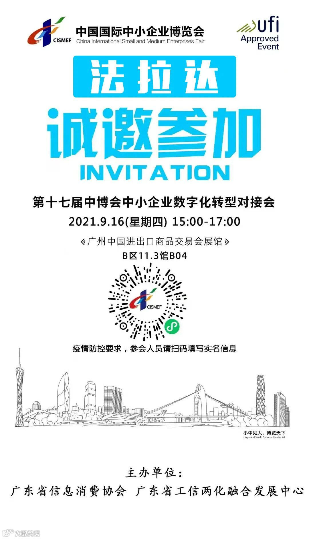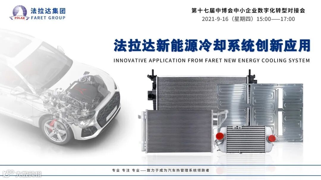 第十七届中博会中小企业数字化转型供需对接会将于2021年9月16日14:30-16:30在琶洲广交会展馆B区11.3馆B04电子信息专题活动区举办。届时将有100多名全球专业采购商进行对接洽谈。法拉达将在现场数字化转型展示路演环节展示《法拉达新能源冷却系统创新应用》诚邀各界客户朋友莅临指导。疫情防控要求,参会人员请扫码填写实名信息。