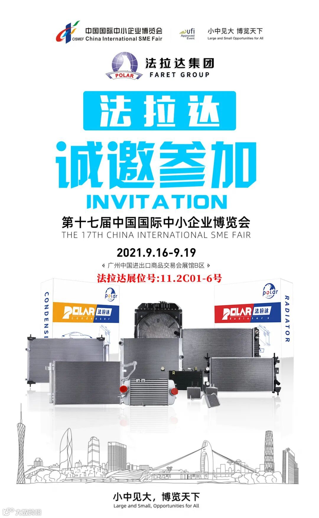 2021第十七届中国国际中小企业博览会(简称中博会)由工业和信息化部、国家市场监督管理总局、广东省人民政府联合主办。2021年9月16日-19日在中国进出口商品交易会展馆(广交会展馆)中心隆重举行。小中见大 博览天下!法拉达集团将携多款新品冷却系统产品亮相“专精特新”展区,欢迎各界客户朋友莅临指导。
