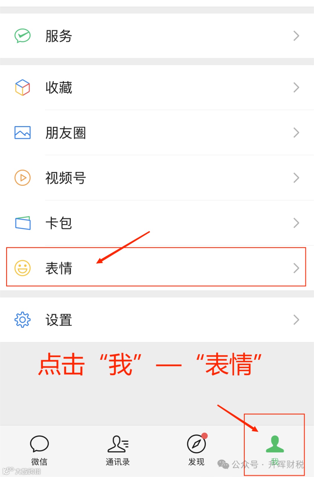 步骤1:在微信界面点击右下角“我”,然后点击“表情”进入表情商店界面