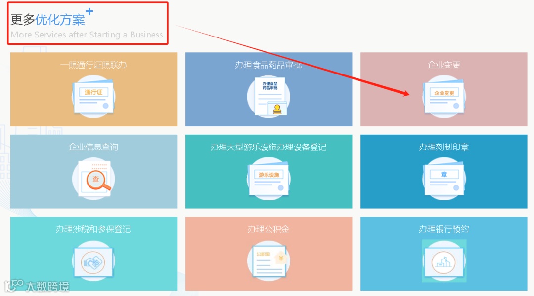 下拉至页面末端“更多优化方案”栏,点击“企业变更”进行全程电子化申报。