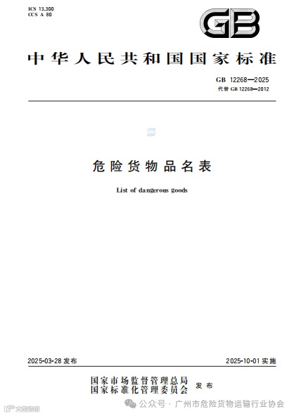 《危险货物品名表》(GB 12268-2025)规定了危险货物品名表的一般规定、结构和内容、包装的基本要求。