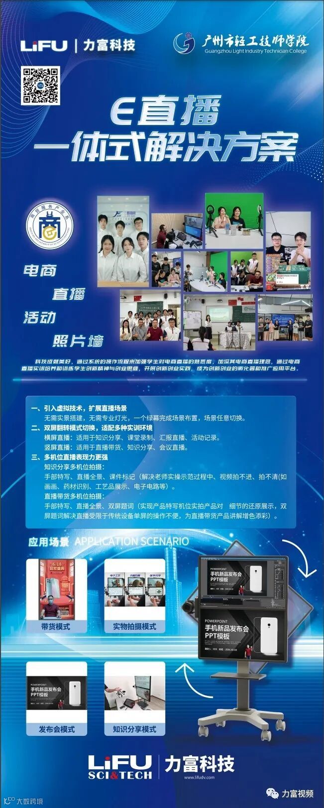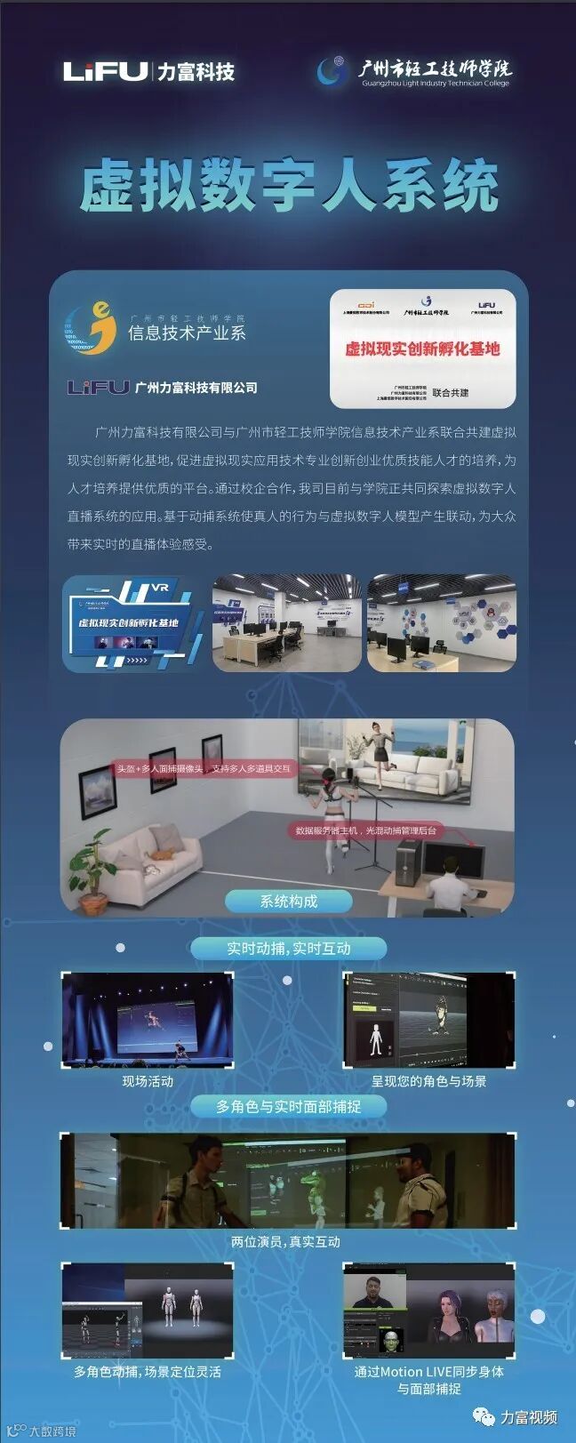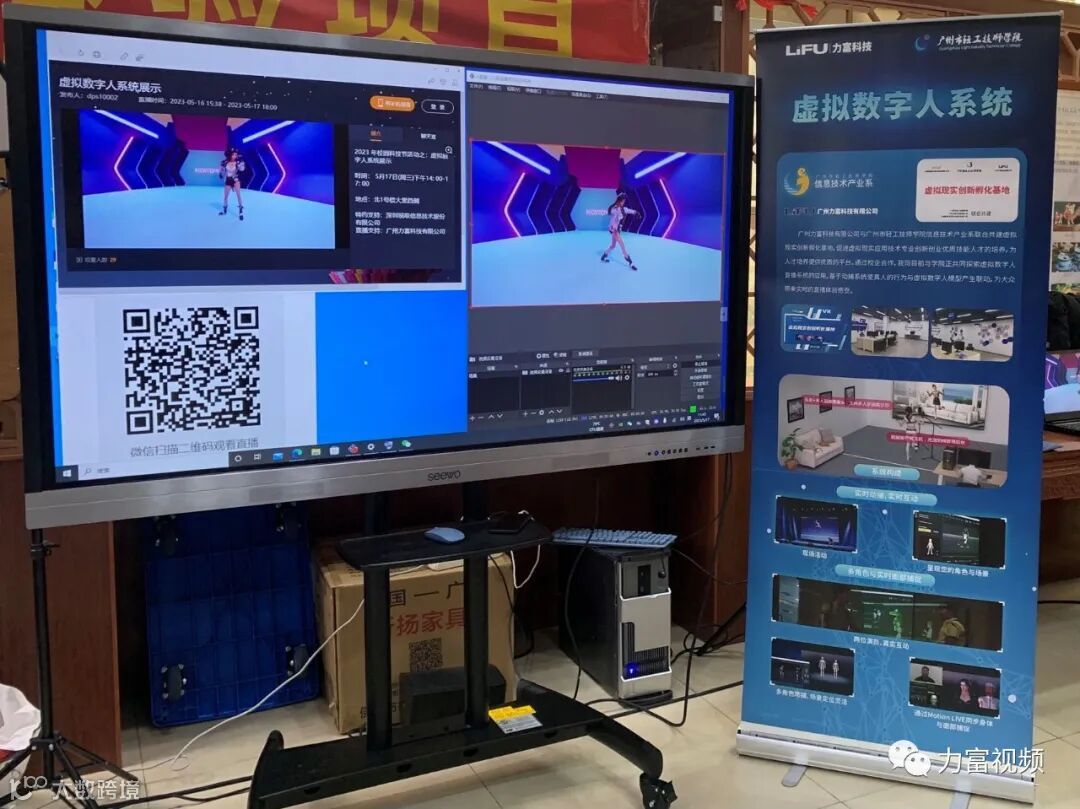 力富联合曼恒、诺亦腾、锐取及学院信息技术产业系展示了数字人系统 ,并在整个活动期间进行了视频直播。力富在校企合作的基础上和轻工技师学院共建虚拟现实创新孵化基地,促进虚拟现实应用技术专业创新创业优质技能人才的培养,为人才培养提供优质的平台。通过校企合作平台,我司目前与学院正共同探索虚拟数字人直播系统的应用。基于动捕系统使真人的行为与虚拟数字人模型产生联动,为师生带来实时的直播体验感受。