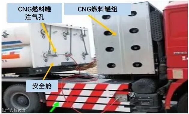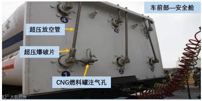 (3)前端安全舱。前端安全舱位于钢瓶组前端,半挂车和车头间部位。前端安全舱依据钢瓶数量对应设置有超压放空管、超压爆破板,当罐车处于超压状态时,可从放空管紧急排放或使压缩气体从爆破板处冲出爆破放散;有的CNG 罐车前端安全舱设有行车CNG燃料 罐注气孔,可为行车燃料罐实施充气。