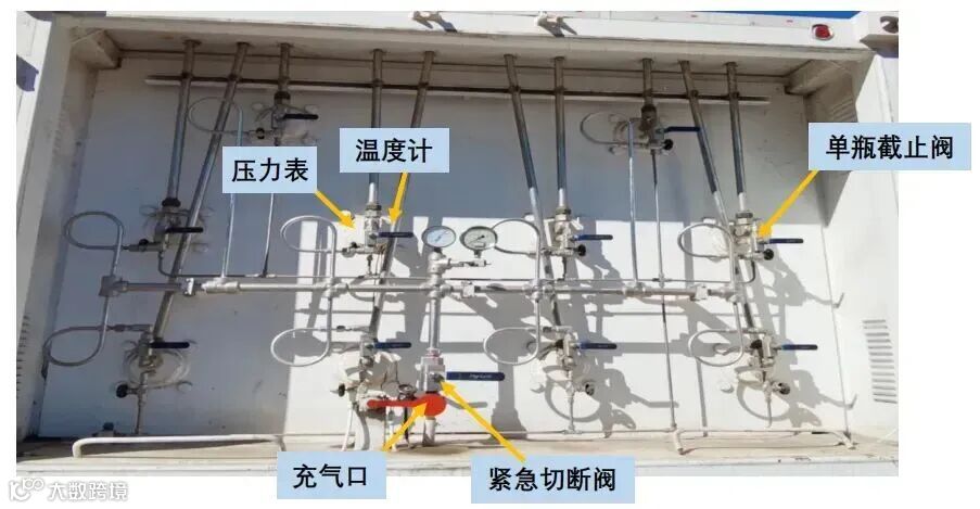 (4)后端操作箱。后端操作箱位于钢瓶组后端(即车尾)。后端操作箱依据钢瓶数量对应设置有超压放空管、超压爆破板、单瓶截止阀、紧急切断阀、超越停车制动连锁、导静电 装置、温度计、压力表等附件,并有管道连接。