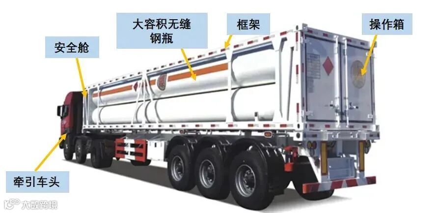 CNG长管拖车主要由半挂车、框架、大容积无缝钢瓶、前端安全舱、后端操作舱5大部分组成。