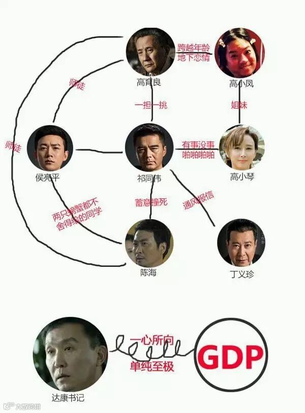 世上没有绝对的好人,但达康书记一心为业绩,一心为人民的行为广受群众的喜欢。热心网友为此绘制了关系图,达康书记一心一意惦记着GDP……完全不care任何人。