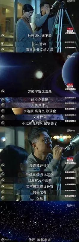 孙连城酷爱浩瀚无垠的星空。电视剧中有段经典台词,当孙区长挂掉达康书记的电话之后,目光通过天文望远镜瞄向整个星空。这时候的一段旁白是: