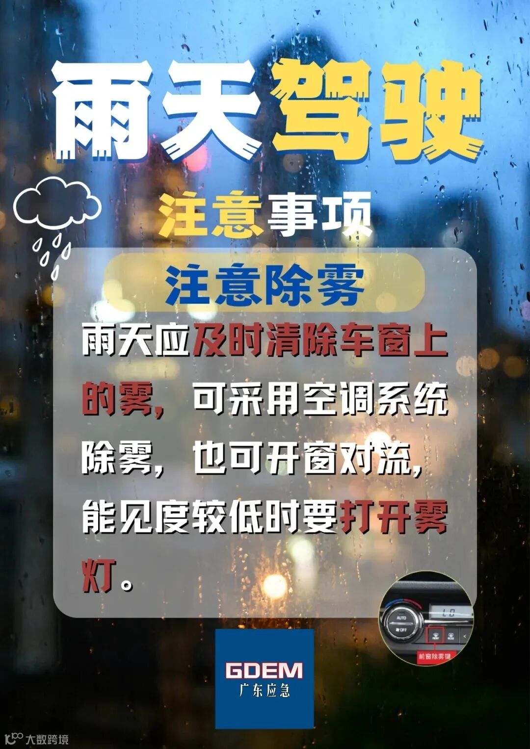 雨天开车出门前要检查雨刷器,如果开车途中车窗有水雾,就把空调调到吹风挡,风口朝向挡风玻璃,用风力把雾气驱除。