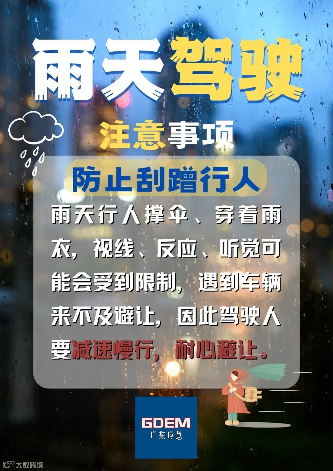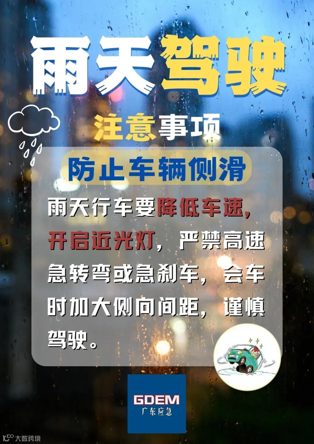 下雨天,视线不佳,道路湿滑,行驶中尽量减少来回并线、变道和超车,尽量选择跟车,不抢风头。