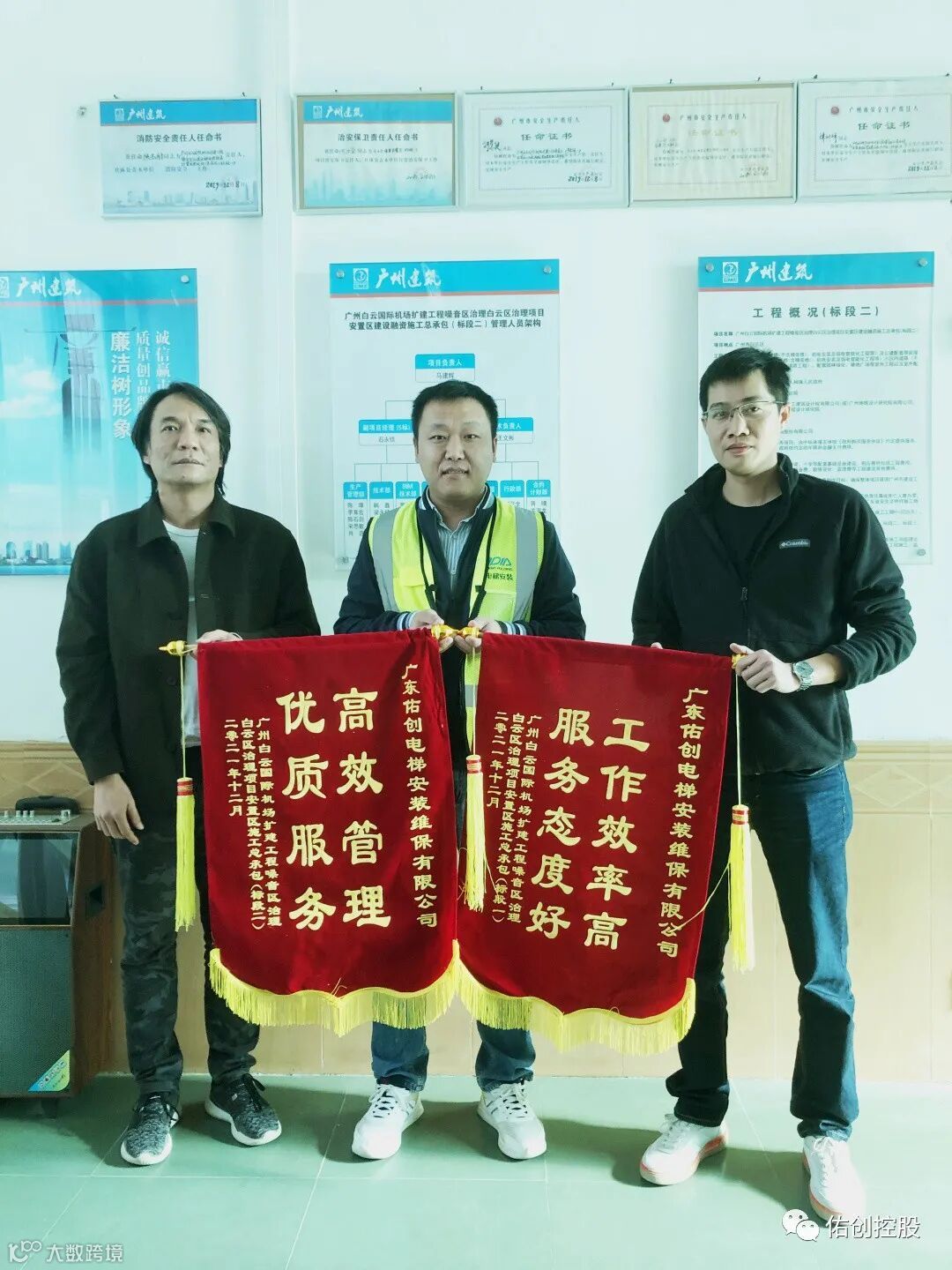2021年12月16日,喜报传来!有感于广东佑创的卓越服务,广州白云国际机场扩建工程噪音区治理白云区治理项目安置区施工总承包(标段一)(标段二)广州建筑股份有限公司主动授予表彰锦旗两面。安装部经理姬贯威代表公司接受了表彰。