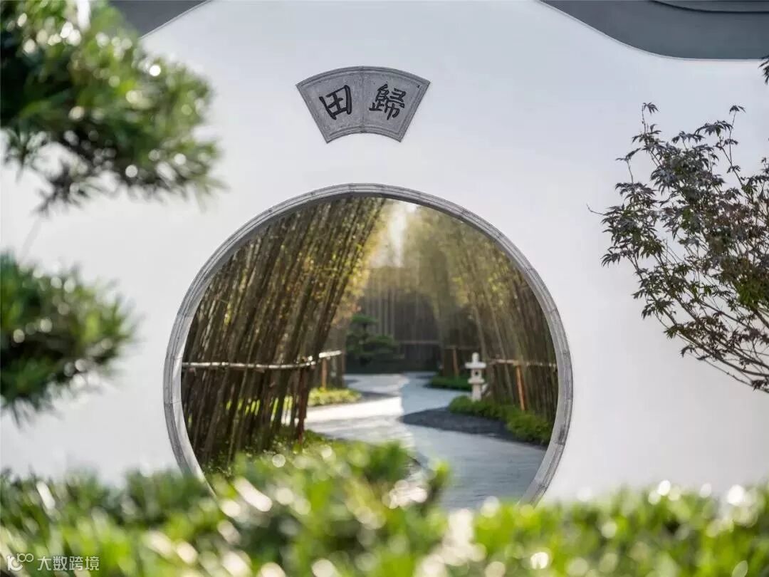 洞门是融创春风桃源巷道步移景异的转折之始。七重园景都有洞门相迎,形似宝瓶,似海棠,又似玉盘,通过洞门透视景物,在不同时刻的阳光下会出现各种各样的光影变化,如同一幅画卷,在桃源内徐徐展开。