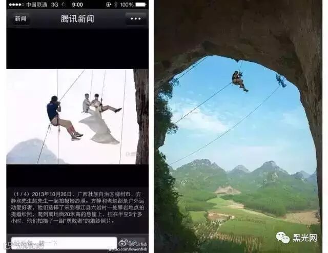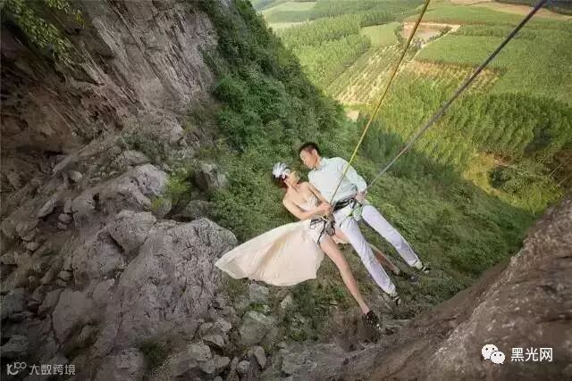 在新人的提议下,毫无攀岩经验的摄影师OY也同这对勇敢的恋人一起,勇敢的掉在几十米高的悬崖上拍了3个小时,当拍摄完成,OY在双脚落地的时候,由于大腿被勒得血液不通,两条腿竟然毫无知觉,坐在地上恢复了10几分钟才能正常行走。