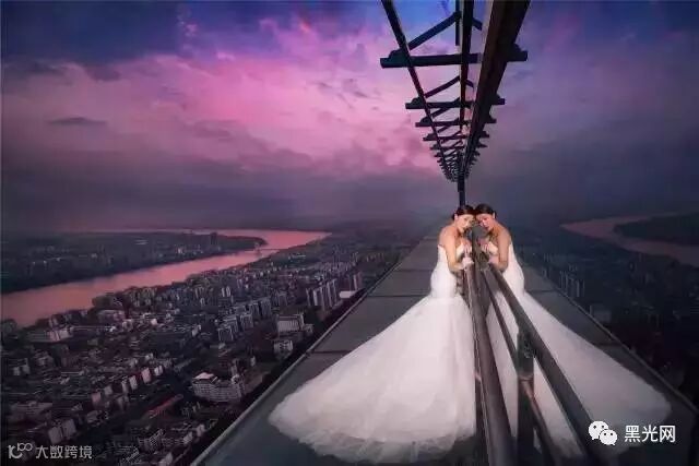 摄影师OY与客人商量后得到一致决定,在柳州地王大厦75层,303米顶楼拍摄婚照。当天下午到达拍摄地,天空还下起小雨,在湿滑的全玻璃幕墙外,拍摄了一组惊险十足的婚纱照,也是绝无仅有的婚纱照。