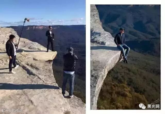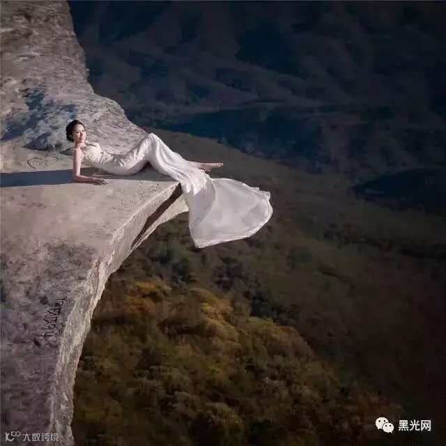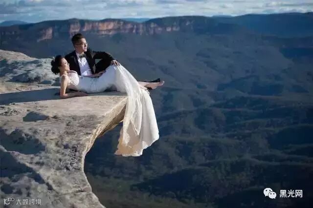 在悉尼的蓝山上,摄影师OY遇到这样一个又险又美的悬崖,一开始他们都不敢站在边上,因为下面就是万丈深渊,后来逐步的适应了,克服了恐高,摄影师OY尝试性的坐在悬崖边上,给了新人一些勇气。就这样,逐步的新人也敢在边上坐下半躺,拍摄出了这个悬崖婚纱照。