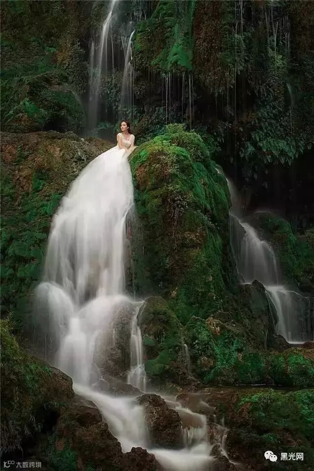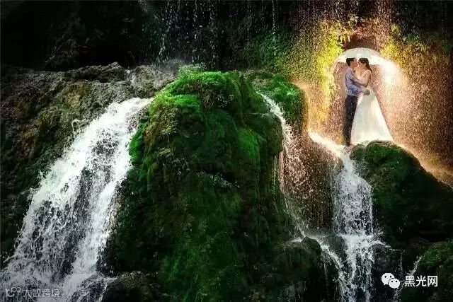趟过又湿又滑在青苔在流淌的水中拍摄婚纱照绝对是考验顾客的耐力和摄影师控制能力。利用相机的慢门原理,加上新人坐在激流的瀑布中,要防止被大水冲下去,还要保持几秒钟不动,才有可能得到婚纱的裙摆和瀑布的水流完美的融合,这样的难度,大家可以脑补下……