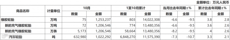 1-10月汽车轮胎出口量为685万吨,同比增长3.3%;出口金额为1158亿元,同比增长2.1%。