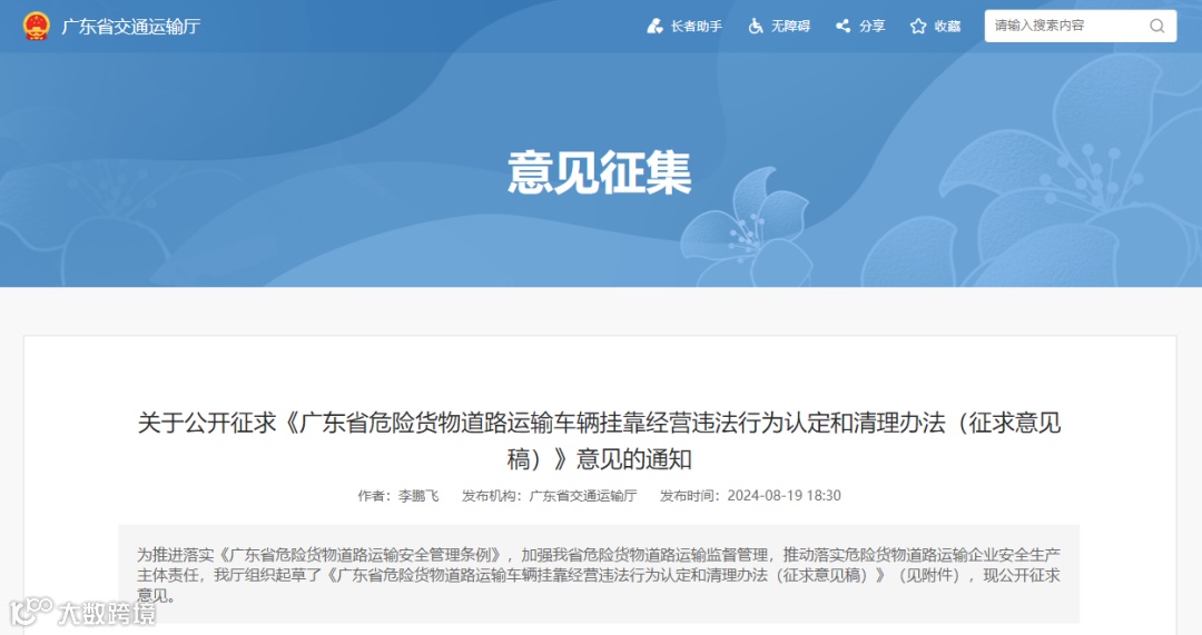 为推进落实《广东省危险货物道路运输安全管理条例》,加强我省危险货物道路运输监督管理,推动落实危险货物道路运输企业安全生产主体责任,我厅组织起草了《广东省危险货物道路运输车辆挂靠经营违法行为认定和清理办法(征求意见稿)》(见附件),现公开征求意见。公众可通过以下途径和方式反馈意见:
