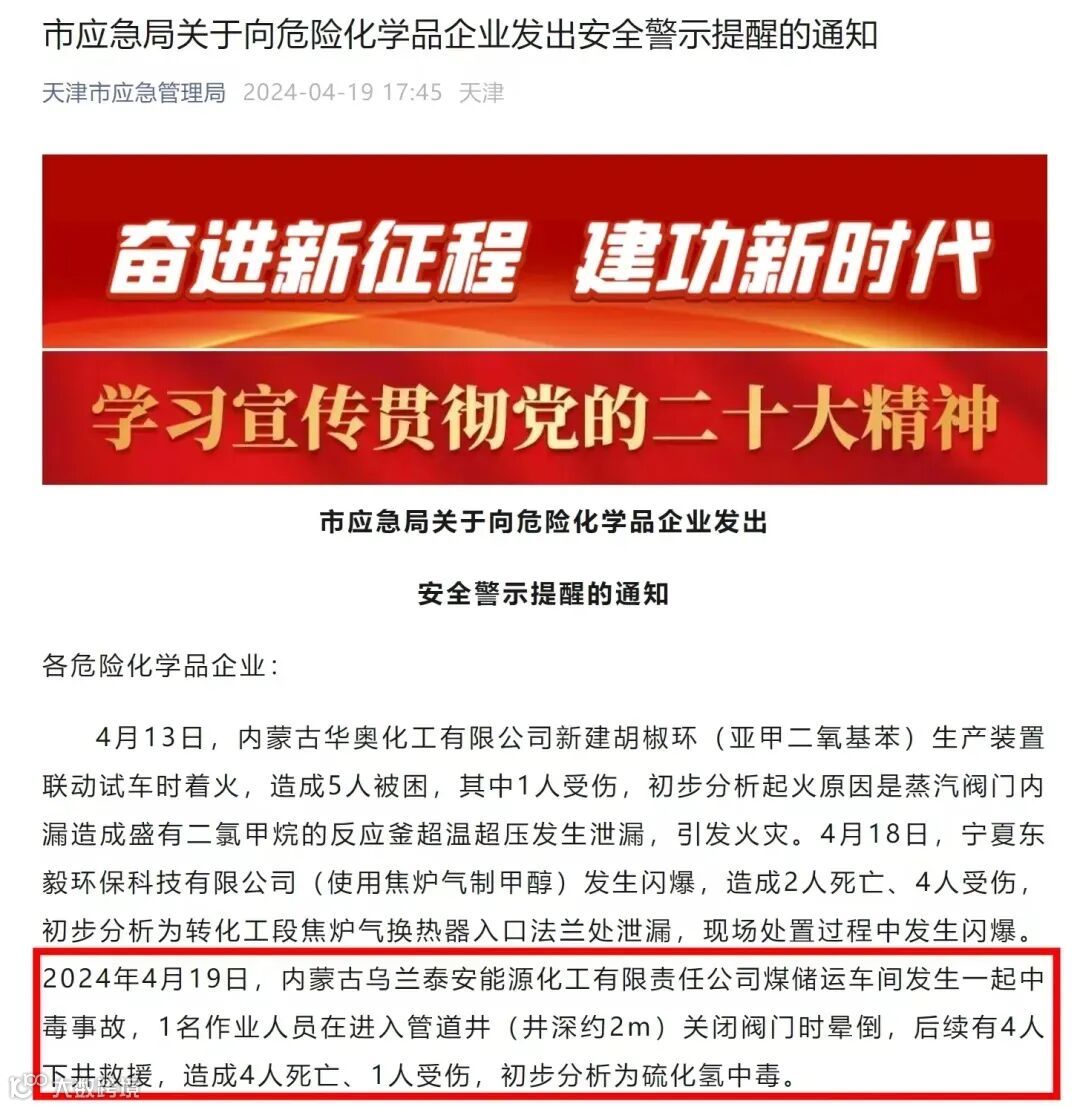 事件:4月19日,内蒙古乌兰泰安能源化工有限责任公司煤储运车间发生一起中毒事故,1名作业人员在进入管道井关闭阀门时晕倒,后续有4人下井救援。事故共造成4人死亡、1人受伤。