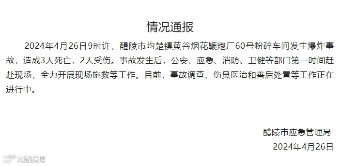事件:4月26日9时许,醴陵市均楚镇黄谷烟花鞭炮厂60号粉碎车间发生爆炸事故,造成3人死亡,2人受伤。
