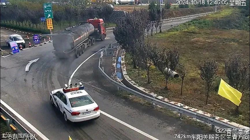 事件:10月18日中午,青兰高速邯郸方向东阳关服务区附近有一辆危化品运输车辆在行驶过程中后方轮胎冒烟,报警人是一名过路司机,鸣笛提示该危化品运输车驾驶员和押运员。