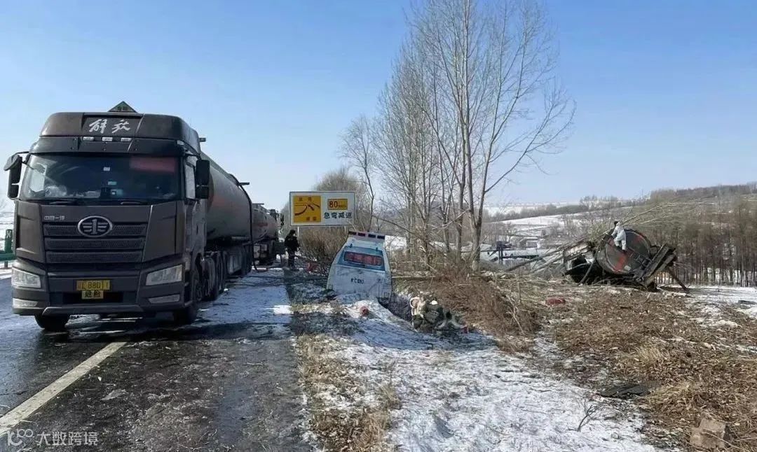 黑龙江鹤大高速一危化品运输车失控侧翻
