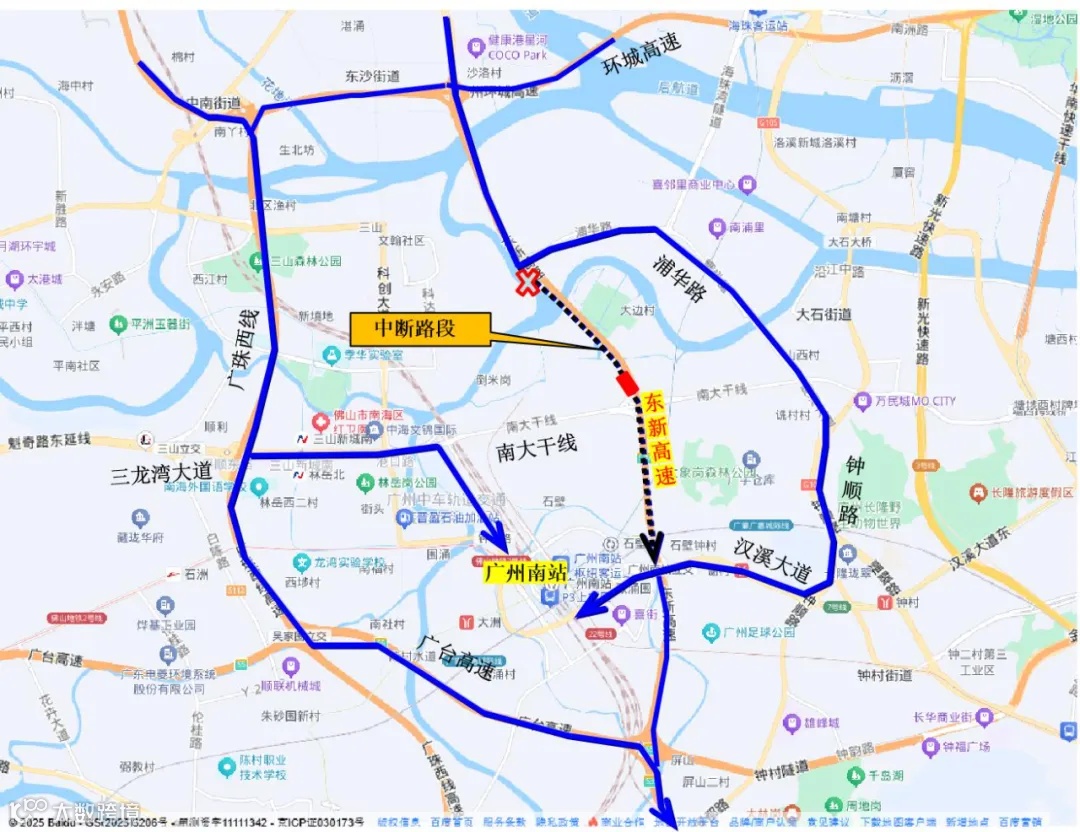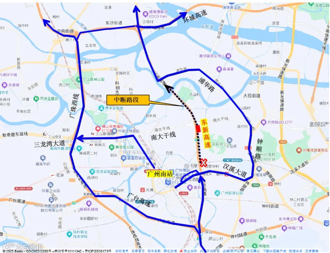 路线一(广州南站往北行):广州南站→汉溪大道→钟顺路→南浦三桥→浦华路→南浦收费站入口→东新高速;或广州南站→三龙湾大道→广珠西线→环城高速。