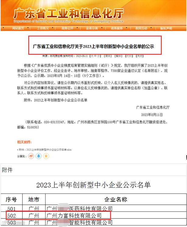2023年8月11日,广东省工业和信息化厅根据《广东省优质中小企业梯度培育管理实施细则(试行)》规定开展了2023年上半年创新型中小企业评价工作,经企业自评、地市审核、抽查等程序,广州力富科技有限公司被评为2023年上半年创新型中小型企业。