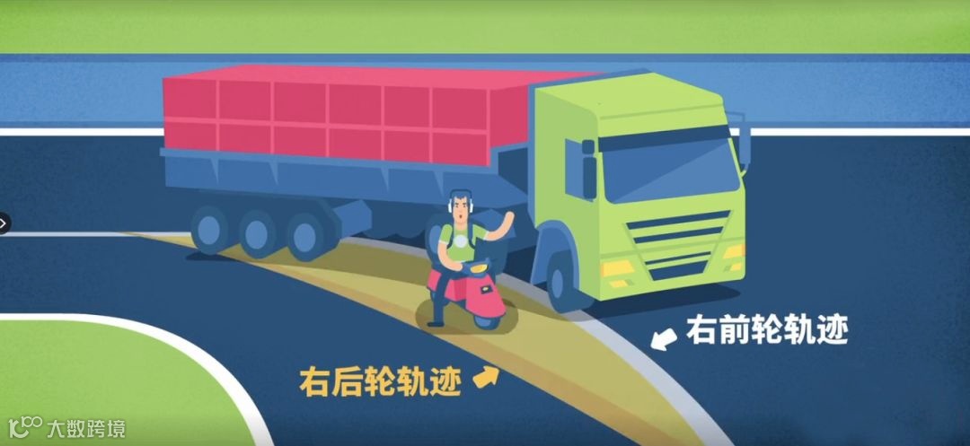 行人、非机动车在大货车前方通行时应确定大货车没有启动的倾向,并注意至少保持2.5米的距离,否则就处于司机视野盲区中,司机一个加速起步就可致命。