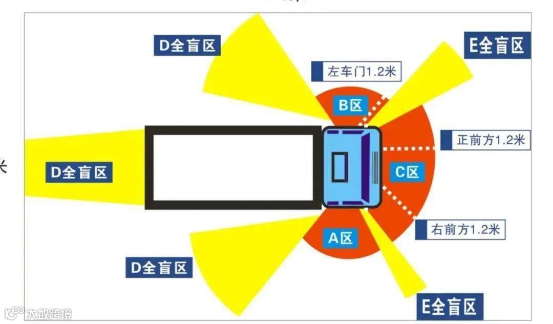 大货车右侧盲区约在货箱末端至驾乘舱末端位置,且距离货车宽度约为1.5米的范围,货箱越大盲区越大。