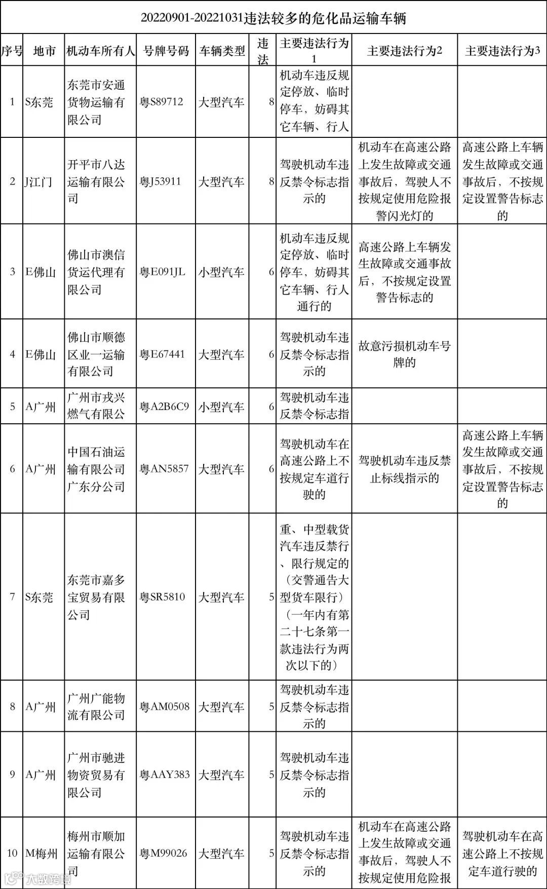 而违法较多的危化品运输车辆,为东莞市安通货物运输有限公司的粤S89712、开平市八达运输有限公司的粤J53911、佛山市澳信货运代理有限公司的粤E091JL等车辆。