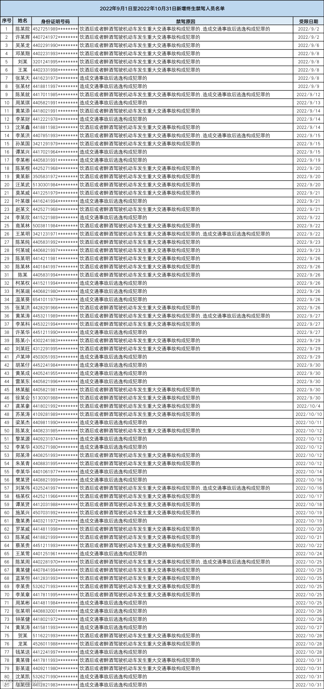 守法驾车,平安回家。广东省公安厅交通管理局公布今年9月1日至10月31日全省新增终生禁驾人员名单81人,并曝光一批事故多发路段及安全风险隐患较高的客运、货运、危化品运输企业及突出违法企业和车辆。