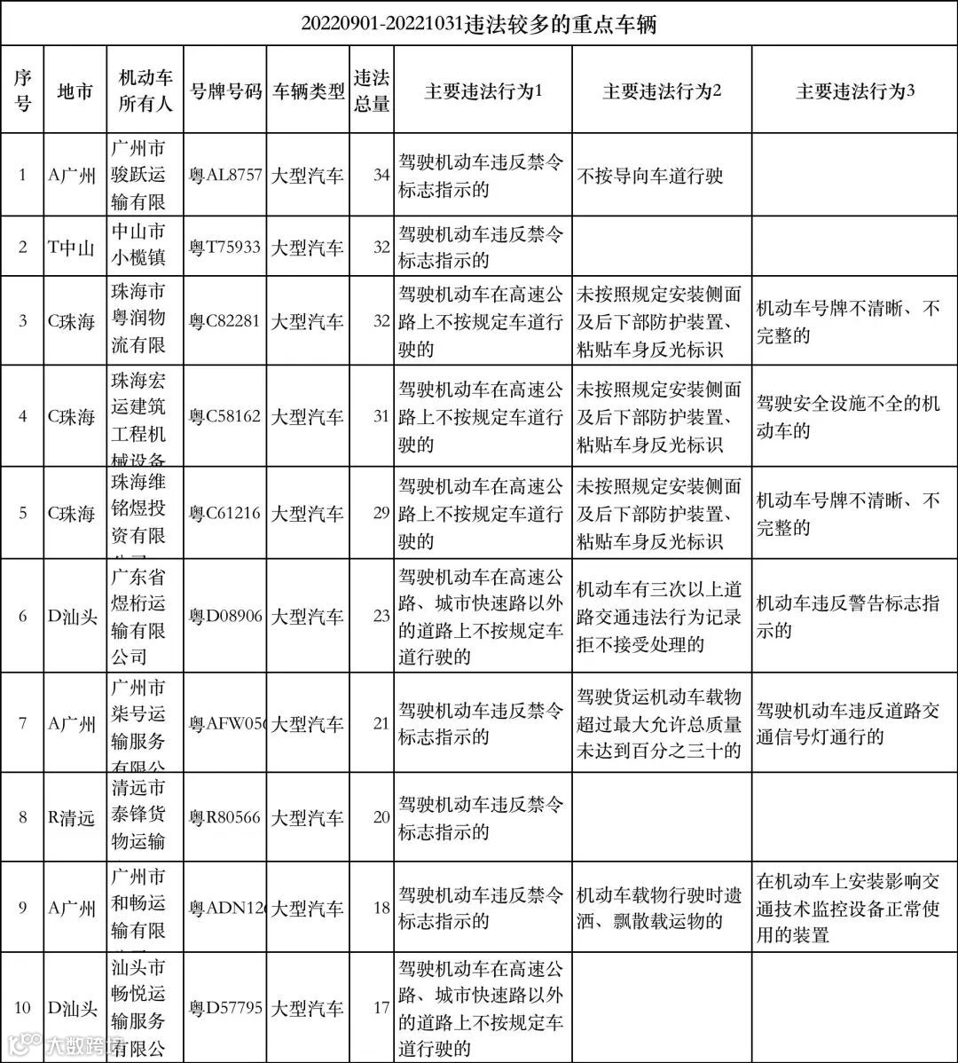 违法较多的重点车辆包括广州市骏跃运输有限公司的粤AL8757、中山市小榄镇陈小菊蔬菜档的粤T75933、珠海市粤润物流有限公司的粤C82281等车辆。