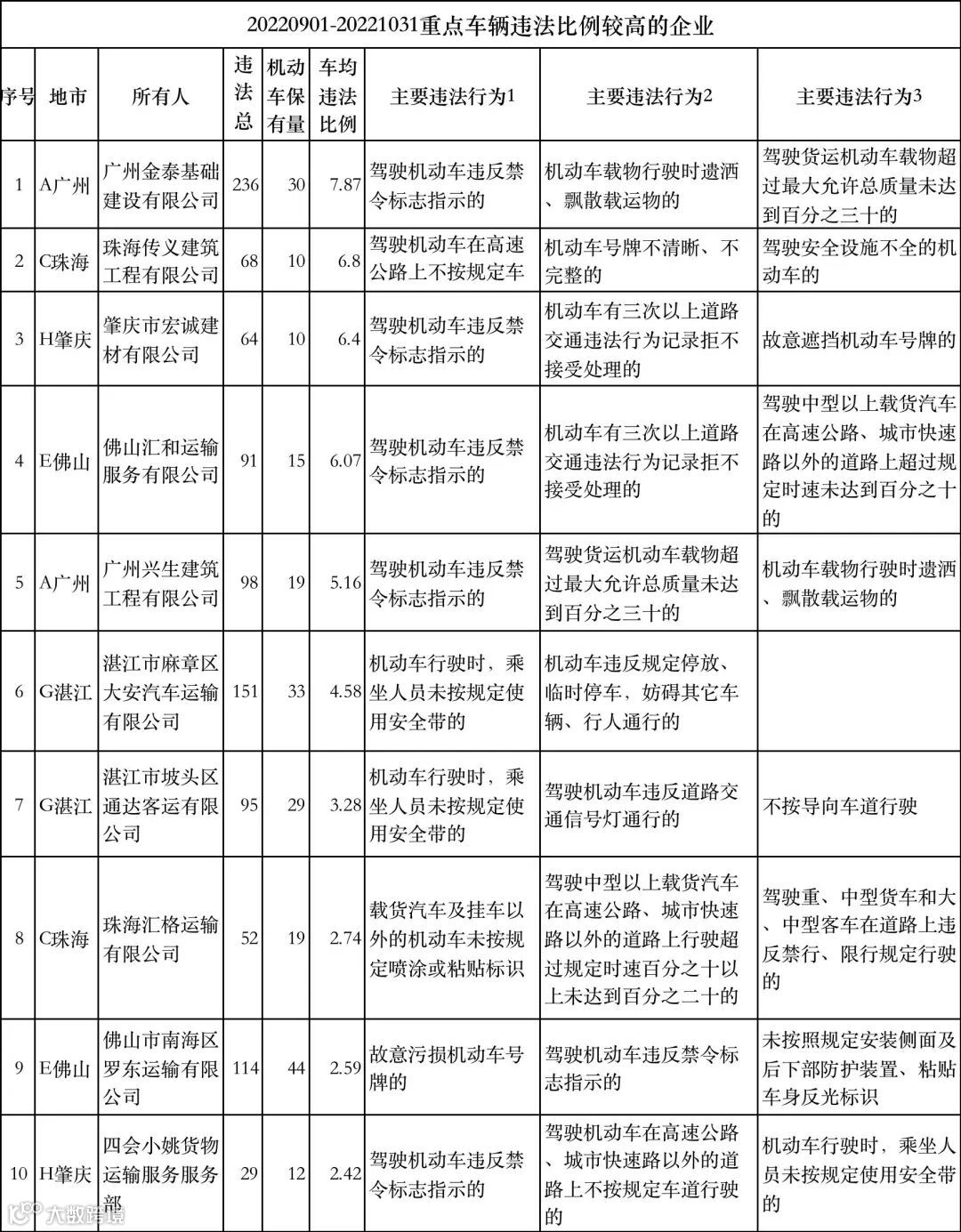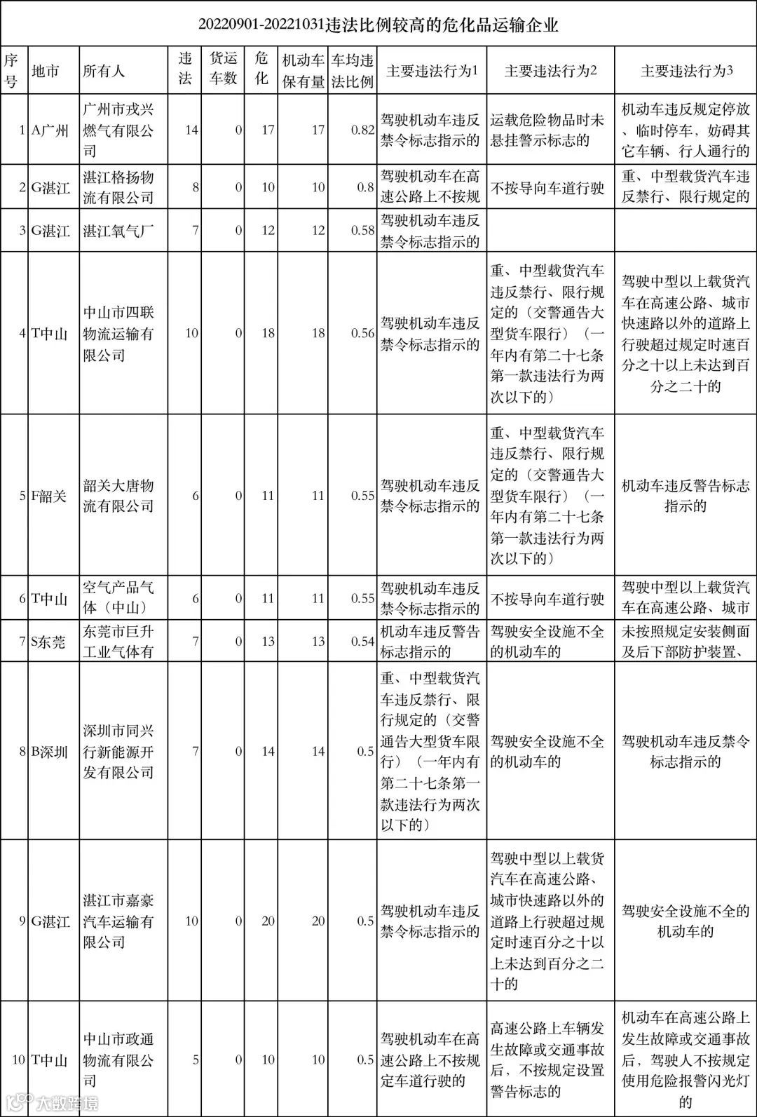此次曝光的交通违法比例较高的10家危化品运输企业包括广州市戎兴燃气有限公司、湛江格扬物流有限公司、湛江氧气厂、中山市四联物流运输有限公司、韶关大唐物流有限公司、空气产品气体(中山)有限公司、东莞市巨升工业气体有限公司、深圳市同兴行新能源开发有限公司、湛江市嘉豪汽车运输有限公司、中山市政通物流有限公司。