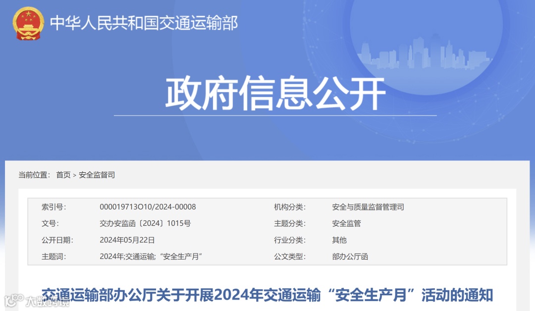 为深入贯彻落实习近平总书记关于安全生产重要论述和重要指示批示精神,根据《国务院安委会办公室 应急管理部关于开展2024年全国“安全生产月”活动的通知》(安委办〔2024〕3号)要求,为组织做好2024年交通运输行业“安全生产月”各项工作。