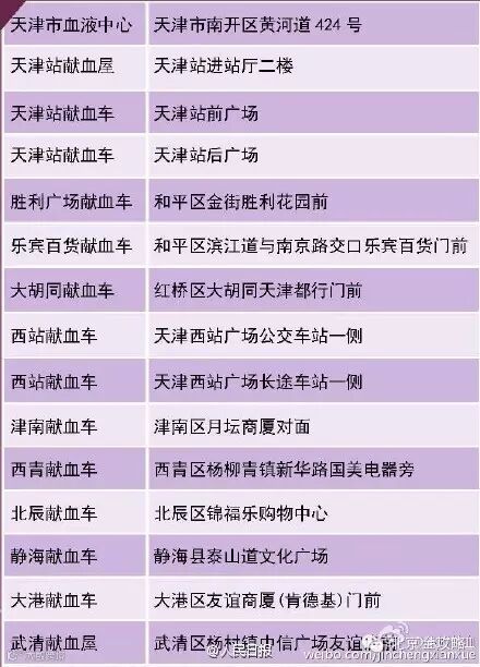 【献血点】天津市血液中心:黄河道424号;胜利广场采血车:和平区金街万达广场对面;伊都锦采血车:和平区滨江道与山西路交口;金摇篮采血车:红桥区大胡同金摇篮商厦门前;图书大厦采血车:图书大厦前广场,津南采血车:月坛商厦门前。献血车一般早上9点到达位置。