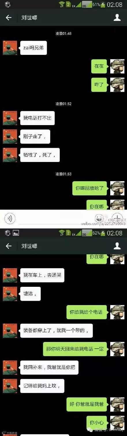 这是昨晚一名天津消防战士和朋友的对话:”刚子死了,牺牲了。我在车上,去塘沽。我回不来,我爸就是你爸,记得给我妈上坟。”
