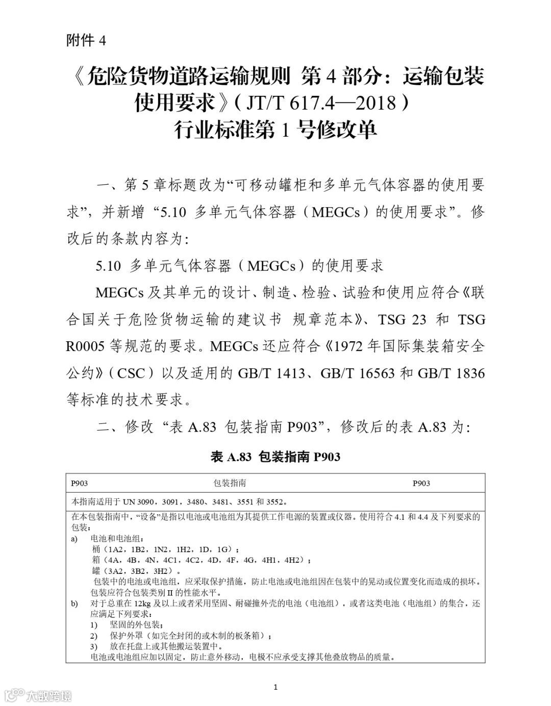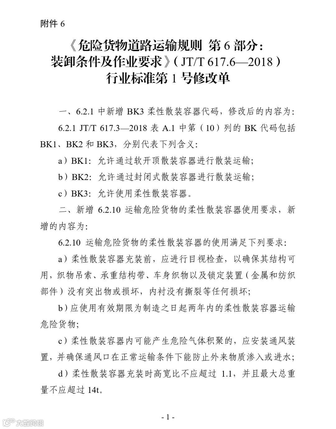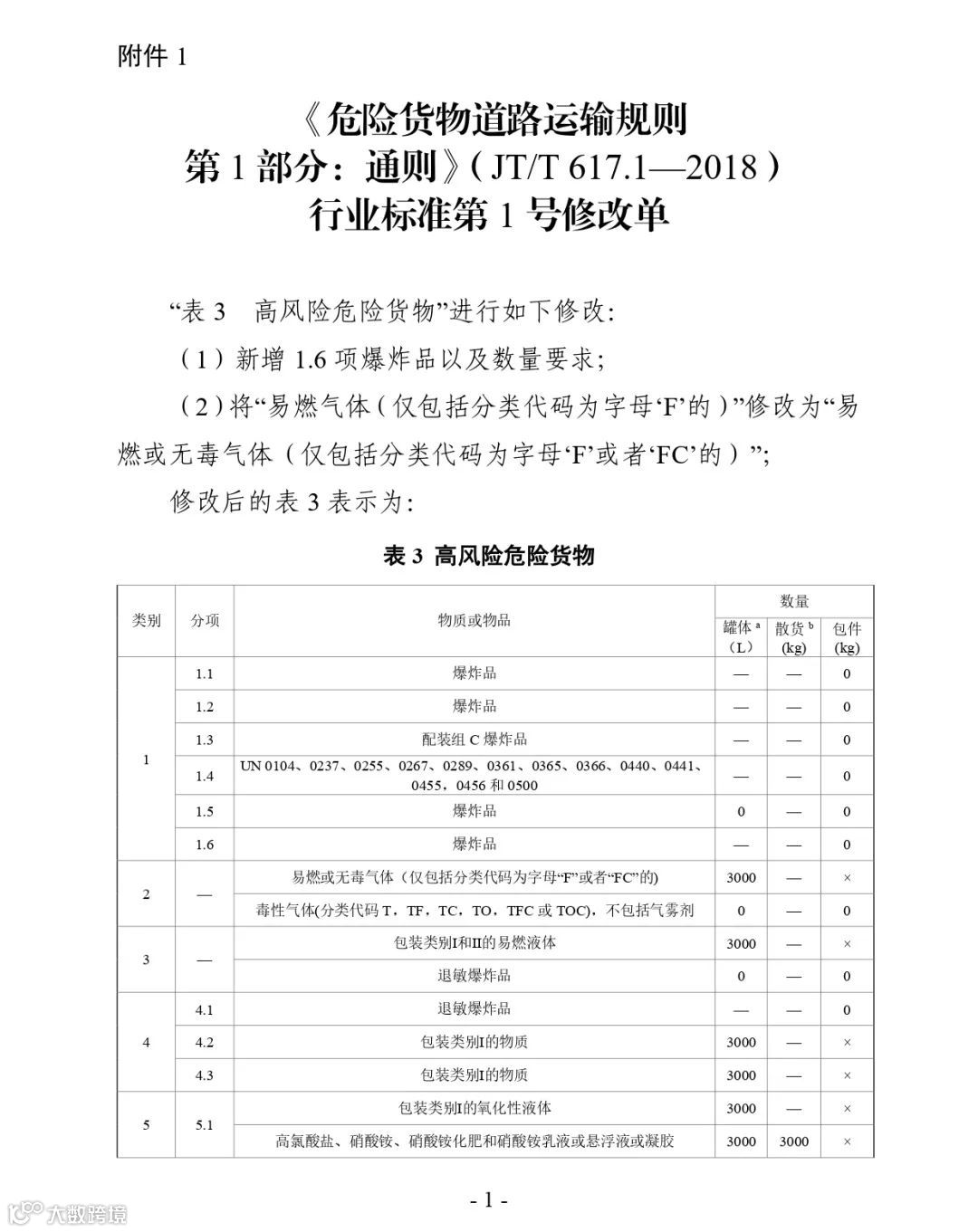 附件:1.《危险货物道路运输规则 第1部分:通则》(JT/T 617.1—2018)行业标准第1号修改单