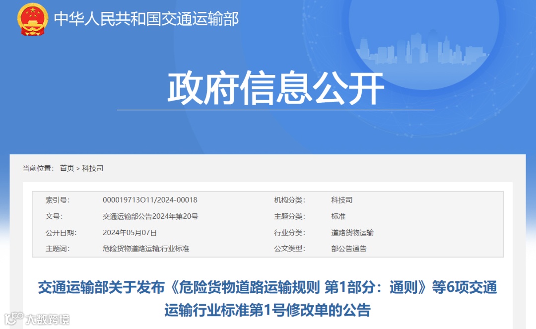 《危险货物道路运输规则 第1部分:通则》等6项交通运输行业标准第1号修改单业经审查通过,现予发布。标准修改单自发布之日起即实施。标准修改单由人民交通出版社股份有限公司出版,并在中华人民共和国交通运输部网站公告。
