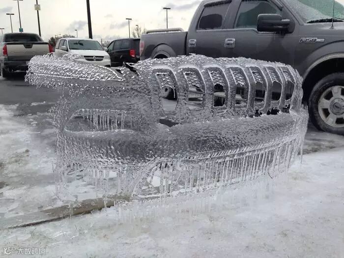 寒冷的室外温差下,形成了车头形状的冰
