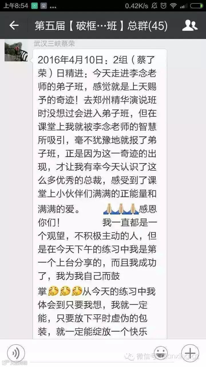 “我不敢相信我的眼睛,昨天我老公走上台的那一刻我惊呆了,李念老师太伟大了!用几个小时的时间就改变了我的老公!感谢李念老师拖起我的家庭、我的老公、我的幸福”