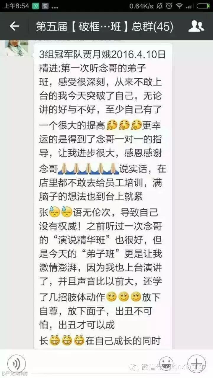 今天我突破了自己!我今天放下了一天的手机!活在当下!我突破了、我上台了,我战胜了,我勇敢了,我改变了!我感谢我老婆、感谢念哥!”