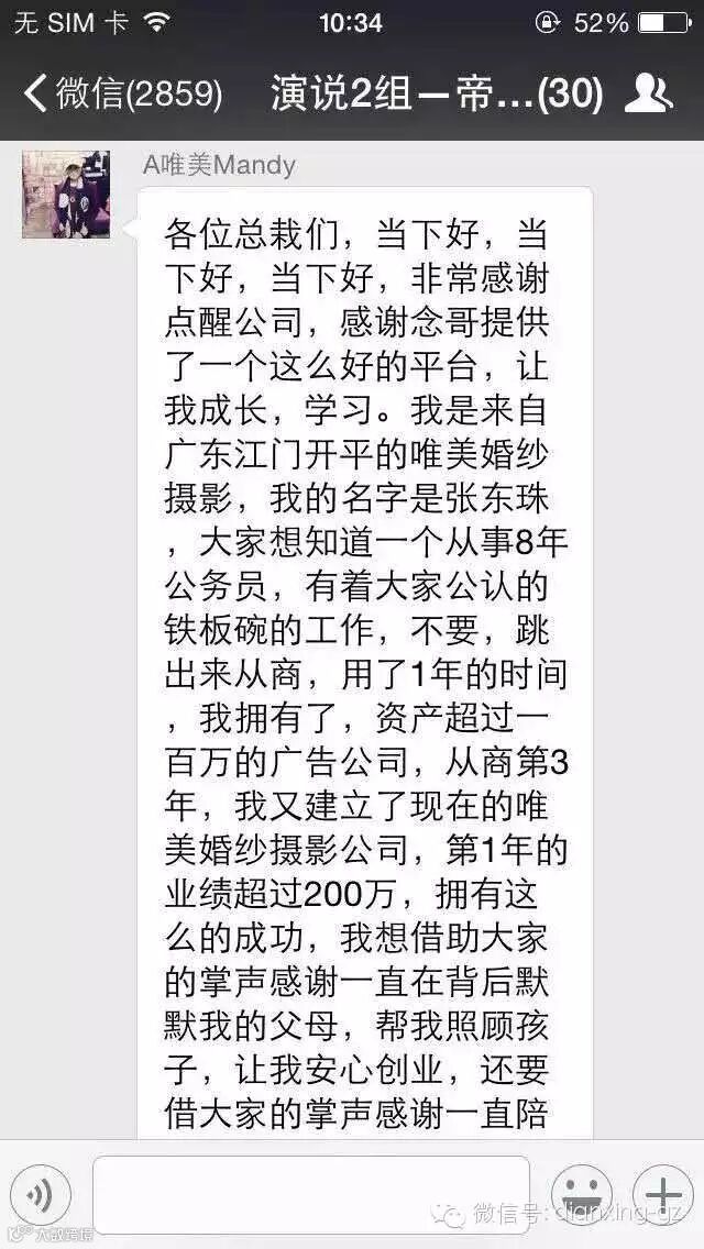 唯有你主动出来才能让更多让认识你,所以我又决定加入念哥弟子班!我发现这里就是一个资源宝库,我学会了一对多的销售,我把我企业现有的优势能够通过我这张嘴传递出去,让更多让能认识我,记住我,我的好朋友经常请我去他们店给他们培训做礼服,让他们业绩也上升,每次我离开的时候,都是给我送了一堆土特产!