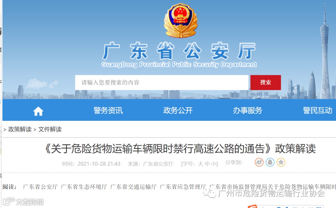 相关阅读: 广东省公安厅 广东省生态环境厅 广东省交通运输厅 广东省应急管理厅 广东省市场监督管理局关于危险货物运输车辆限时禁行高速公路的通告