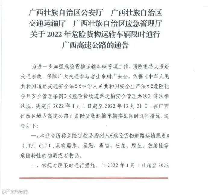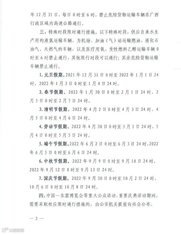常规限行:自2022年1月1日起至2022年12月31日,每日0时至6时,禁止危险货物运输车辆在广西行政区域内高速公路通行。