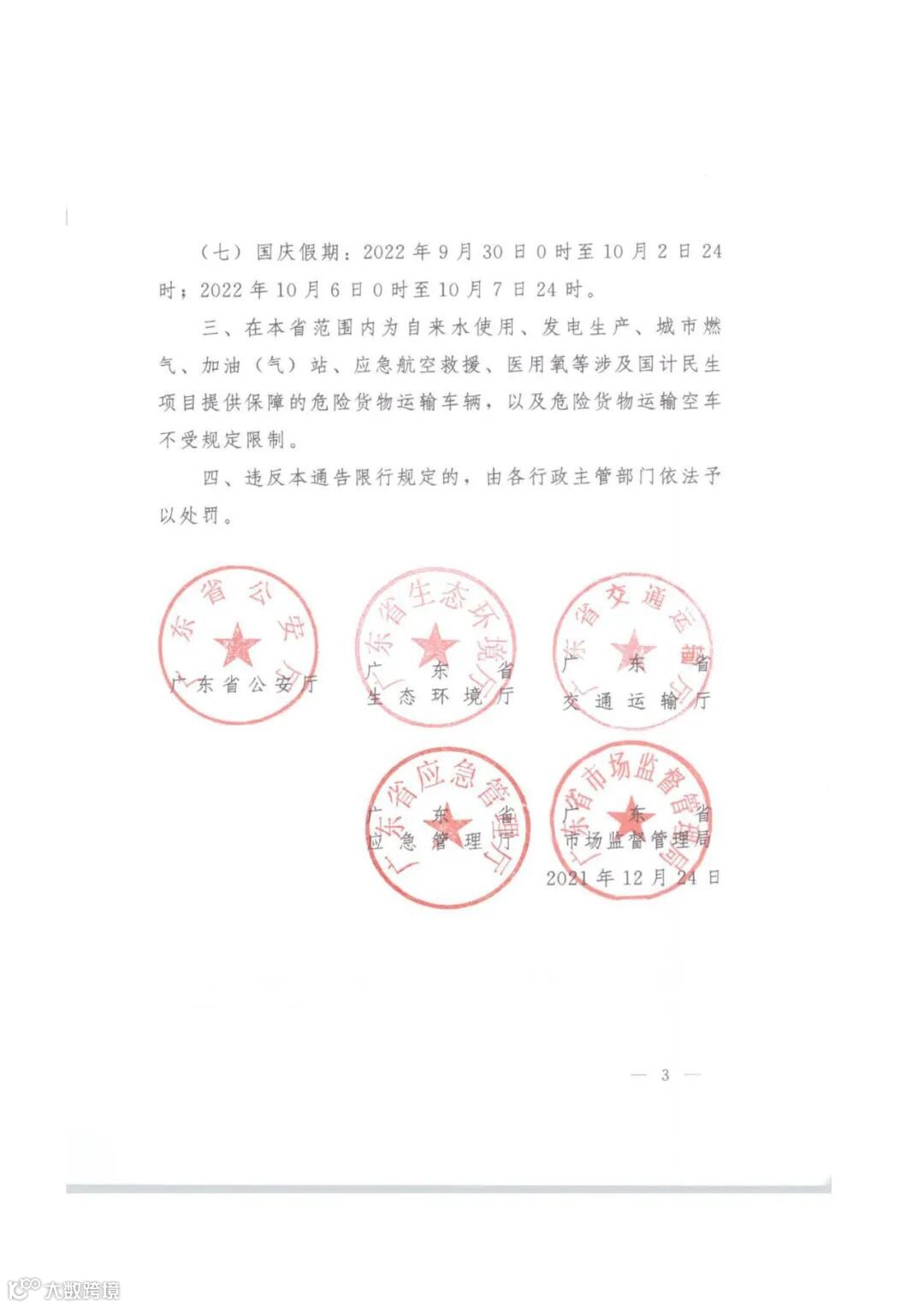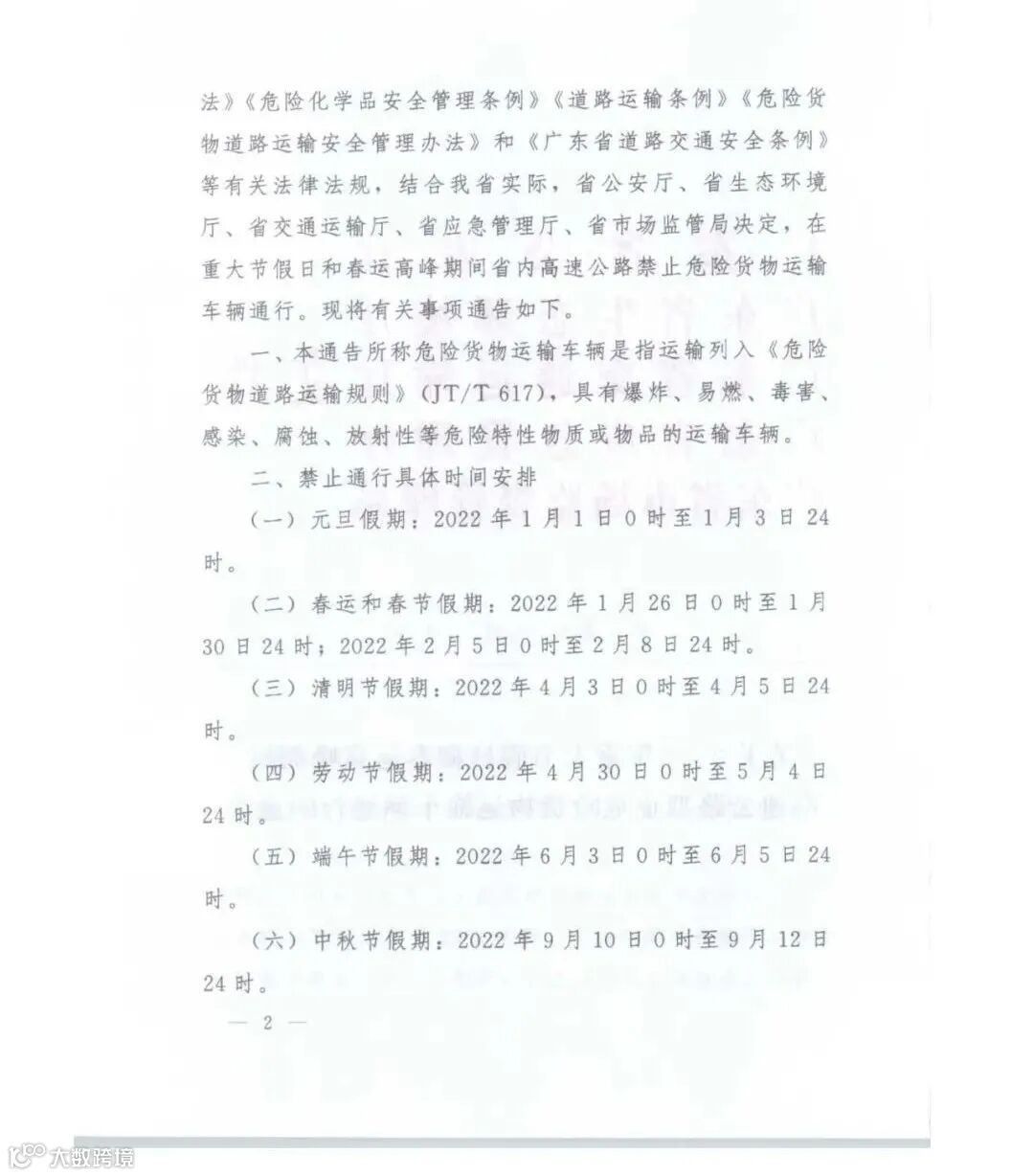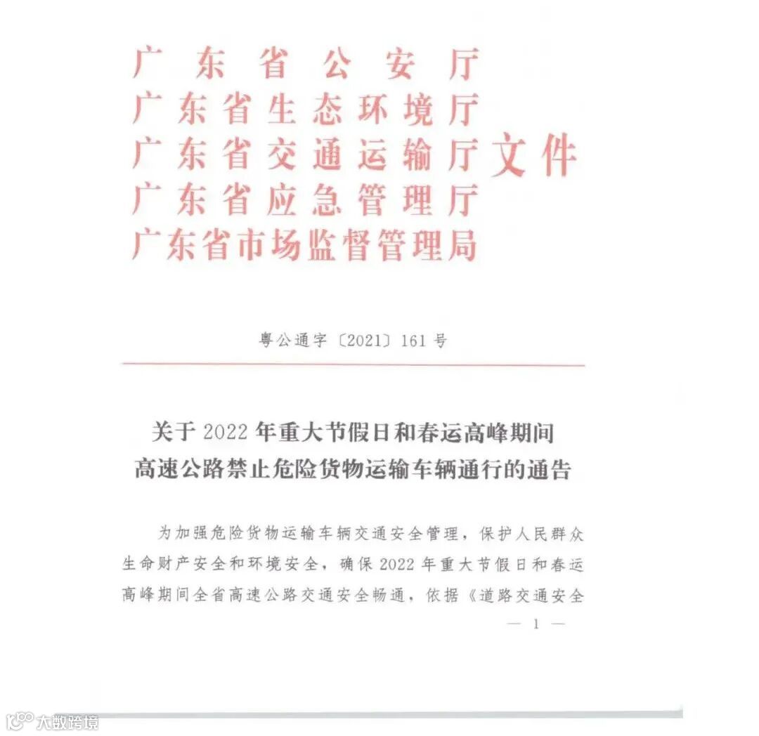 常规限行:自2021年11月1日起,广东省境内高速公路0时至6时禁止危险货物运输车辆通行。