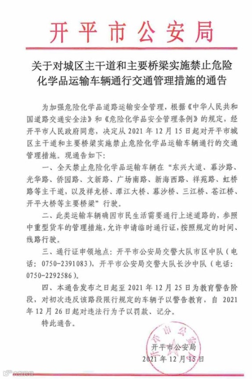 近日,广东开平市发布最新危险品限行措施,12月15日起实施。